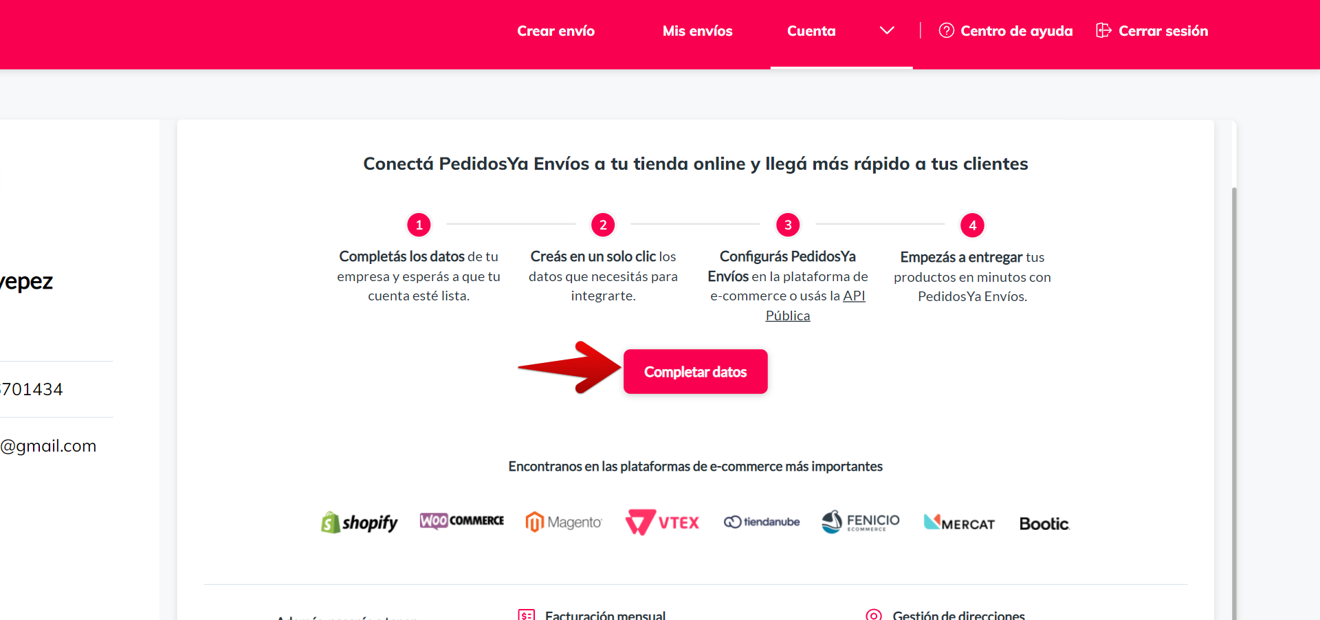 Para utilizar el servicio es necesario tener una cuenta en PedidosYa Envíos, si no la tienes registrate de manera online en https://envios.pedidosya.com.ar y comenzá a ofrecer envíos express a tus clientes. Hacé clic en “Crear Cuenta” y cuando tengas creada tu cuenta, podes conectar PedidosYa Envíos a tu Tienda Online dentro de la sección Cuenta del Menú superior >> Integraciones.